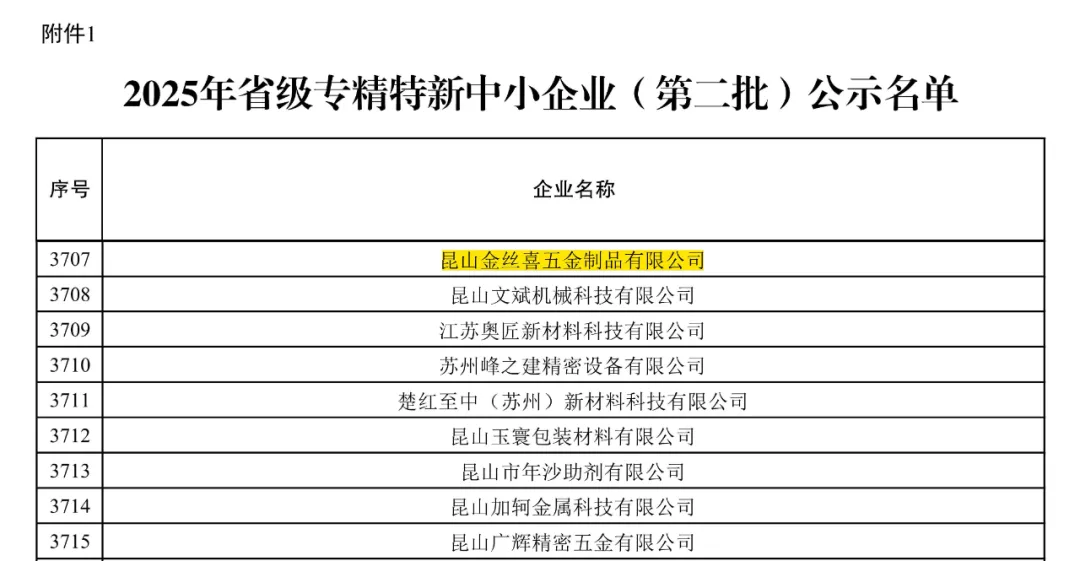 Slovenski সম্প্রতি, জিয়াংসু প্রাদেশিক শিল্প ও তথ্য প্রযুক্তি বিভাগ আনুষ্ঠানিকভাবে 2025 সালের জন্য স্বীকৃত জিয়াংসু বিশেষায়িত এবং অত্যাধুনিক এসএমইগুলির সর্বশেষ ব্যাচের ঘোষণা করেছে। কুনশান জিনসিক্সি মেটালওয়্যার কোং, লিমিটেড সফলভাবে নির্বাচিত হয়েছে এবং একটি চমৎকার প্রযুক্তিগত, অবিচ্ছিন্ন এবং দ্রুত গুণমানসম্পন্ন পণ্যের গুণমানের কারণে "জিয়াংসু বিশেষায়িত এবং অত্যাধুনিক এসএমই" উপাধিতে ভূষিত হয়েছে। সাব-সেক্টর
